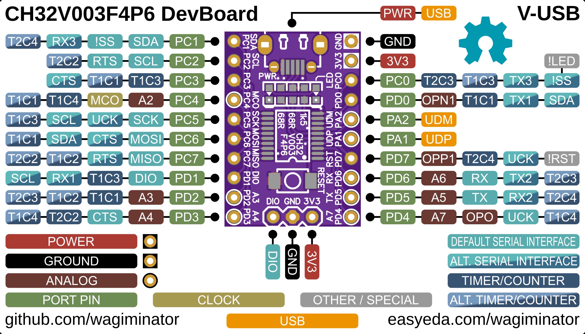 Серия микроконтроллеров CH32V003 основана на ядре QingKe RISC-V2A, поддерживает основную частоту 48 МГц, широкий диапазон напряжений питания, однопроводной последовательный интерфейс отладки, низкое энергопотребление. Включает в себя контроллер DMA, 10-битный АЦП, компараторы на операционных усилителях, несколько таймеров и стандартные интерфейсы связи: USART, I2C, SPI и т.д.